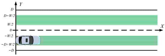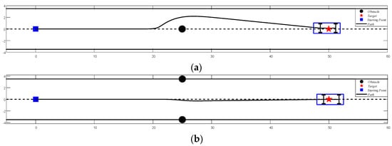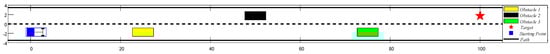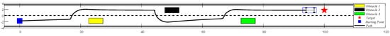 Taking two lanes in both directions as an example, in the initial state, the position of the subject vehicle is (0 m, −1.75 m) and the target position is (100 m, 1.75 m). Assuming that the subject vehicle moves at a constant speed of 10 m/s, the initial positions of static obstacle vehicle 1 and static obstacle vehicle 2 are (15 m, 1.75 m) and (50 m, −2.5 m), respectively, the location relationships are shown in Figure 10.