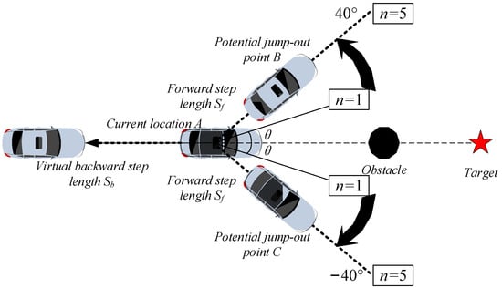 The intelligent vehicle will stall or oscillate when it falls into local minima. To solve this problem, this paper proposed a strategy, that is searching for potential jump out points within the steering angle range as shown in Figure 5. The specific steps are as follows: