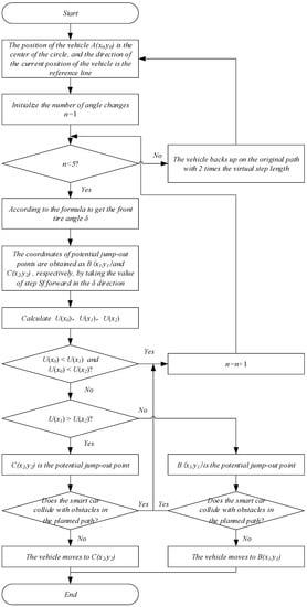 When determining the potential jump-out points, attention should be paid to whether the line between the current position of the intelligent vehicle and the potential jump-out point will collide with the obstacle. If a collision occurs, the potential jump-out point should be discarded and searched again. The planned trajectory and front tire angle should satisfy Equation (12). The flowchart of the strategy is shown in Figure 6.