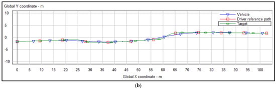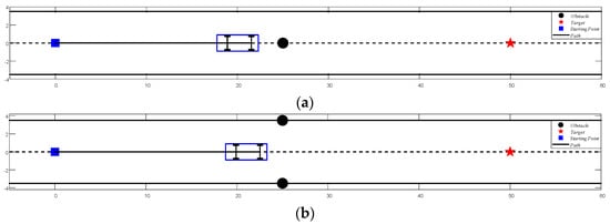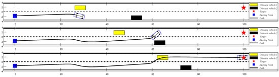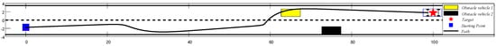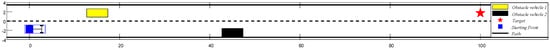 Still take two lanes in both directions as an example, in the initial state, the initial position of the subject vehicle is (0 m, −1.75 m) and the target position is (100 m, 1.75 m). Assuming that the subject vehicle is moving at a constant speed of 10 m/s, the initial positions of dynamic obstacle vehicle 1 and dynamic obstacle vehicle 2 are (15 m, 1.75 m) and (50 m, −2.5 m) respectively, the location relationships are shown in Figure 14.
