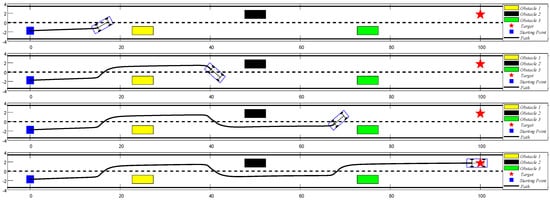 From Figure 7, it can be seen that the vehicles all fall into local minima, and the coordinates of the local minima are (19 m, 0 m) and (19.8 m, 0 m). The results of path planning are failures because they fail to achieve their targets. The simulation results of the improved APF method are shown in Figure 8.