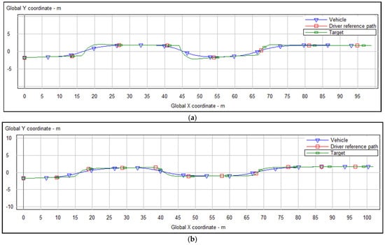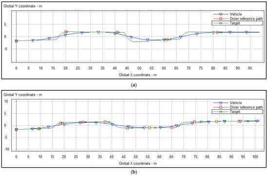 Comparison of planned trajectory and actual trajectory for expected vehicle speed of 10 m/s in static obstacles driving environment. (a) Planned trajectory by traditional APF and actual trajectory of vehicle; (b) planned trajectory by improved APF and actual trajectory of vehicle.