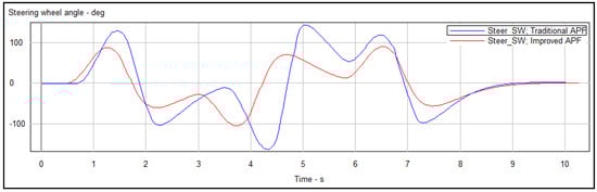 In order to exhibit the amount of steering wheel angle variation of the intelligent vehicle under different speeds, we set two groups of speed commonly used in urban road environment, 10 m/s and 15 m/s. These two groups of speed will be used as the expected speed of the subject vehicle to track the trajectory planned in the previous section. Since it is only necessary to obtain the variation rules of steering wheel angle before and after the improved APF method, the article only takes the default tracking model in Carsim. In static obstacle environment, Figure 18 compared the planned trajectory and the actual trajectory for expected vehicle speed of 10 m/s. The Euclidean errors of the planned trajectory and the actual trajectory for expected vehicle speed of 10 m/s are shown in Figure 19. The variation curves of steering wheel angle for expected vehicle speed of 10 m/s in static obstacles driving environment are shown in Figure 20.