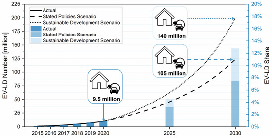 It therefore becomes essential to rapidly increase transportation sustainability, still satisfying user expectations and transportation needs as far as possible. Certainly, the most attractive among the emerging alternatives is electric mobility: electricity is used in place of liquid fuels as energy vectors, substantially contributing to pollution reduction in urban contexts, and simultaneously finding new utilization space for electricity produced by renewable energy sources (RES) (e.g., wind, hydro, and solar energy). The sustainability of our whole energy system may be strongly increased, thanks to the widespread availability and inherently pollutant-free nature of RES. According to this transition paradigm, electric mobility shares are currently rapidly increasing, already reaching over 10 million electric vehicles (EV) worldwide, including Battery Electric Vehicles (BEVs), Plug-in Hybrid Vehicles (PHEVs), and Fuel Cell Electric Vehicles (FCEVs), namely over 8 times more compared to 2015 (1.2 million electric cars). However, despite its rapid growth, electric vehicles in 2020 still account for only 1% of the overall circulating stock in the light duty (LD) transport sector. According to International Energy Agency (IEA) those shares will rapidly grow in the near future and will reach among 7.5% and 12.8% by 2030, as shown in Figure 1, depending on the projection scenario [4]. Indeed, in the Stated Policies Scenario (STEPS—namely a situation that reflects all existing policies and targets that have been legislated or announced by governments around the world) the estimated average annual growth rate of EV stock will be 30%, reaching almost 140 million light duty vehicles (LDVs) sold by 2030, while in the so-defined Sustainable Development Scenario (SDS), over 220 million electric LDVs are projected to be circulating by 2030, corresponding to an almost 12.8% stock share. SDS is a more ambitious scenario, in line with EV30@30 signatories, a campaign launched at the 8th Clean Energy Ministerial (CEM) in June 2017 and supported by 15 member countries and several international companies and organizations, whose objective include achieving a 30% sales share in 2030 for light duty EVs [5].