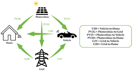 One of the major issues hindering the spread of V2G systems concerns the contractual front between customers and suppliers, in particular the management of a potentially high overall accumulation but of a continuously variable size and widespread ownership [11]. Most V2G technologies do not only require a local application because the electric grid may not be able to cope with their high requirements in terms of dynamic power requests. Some of them, however, may be already implemented on smaller scales, while vehicle ESSs are connected with individual homes (Vehicle-to-Home, V2H), as shown in Figure 2, or small/medium buildings (Vehicle-to-Building, V2B) charging points [12,13]. Both V2H and V2B systems do not require relevant modifications neither from an urbanistic nor an electric grid point of view. In addition, the management of these charging systems is much simpler than that of V2G ones, due to the type of connection, namely private and dedicated to the interface with known vehicles and in a well-defined contractual context [14].