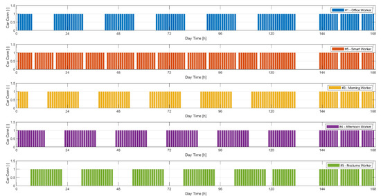 The described behaviors are valid during the weekdays, while, on holidays and weekends, they tend to be all similar to each other. For the purposes of this work, it was assumed that users leave their homes mainly on the days before holidays, while they tend to stay at home on holidays. By combining this last hypothesis with the characteristics for the individual end users, it is possible to obtain a hypothetical weekly plan for the connection of electric cars to the home recharging stations, as shown in Figure 3.