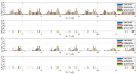 The description of how the daily loads were calculated can be found in [23,24,25]. The sum of these two types of consumptions allowed the obtainment of an annual electricity consumption plan for each end user. Figure 4 shows this plan, detailed for 4 typical weeks in the different seasons of the year depending on the presence of heating and refrigeration loads.