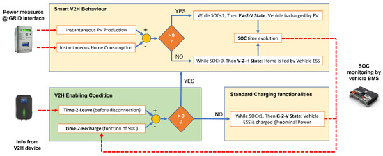The main management logic underlying this algorithm is the fulfillment of a pre-condition for which the device can enable V2H functionality (which may be one or bi-directional). This enabling condition is based on the comparison between two timespans, which are instantaneously estimated and monitored by the control algorithm: