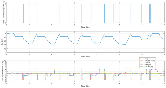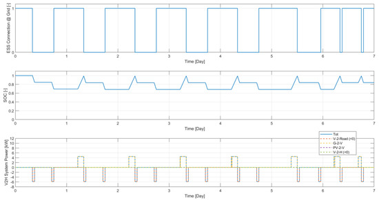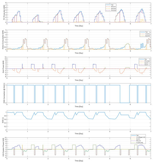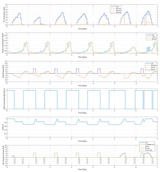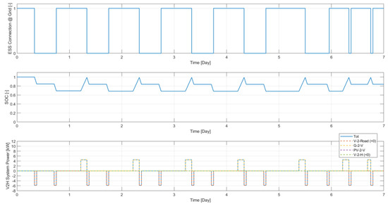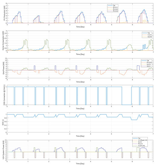 In this case, the V2H functionality is enabled in the bi-directional mode, also providing for the possibility of powering domestic loads through the vehicle ESS connected to the network. The results are shown in Figure 15 and Figure 16.