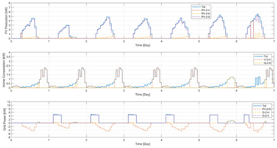 - The first row shows the overall electricity production (PV thicker curve) and its distribution among the secondary flows: towards domestic users (PV2H); towards the vehicle storage system (PV2V); sold to the network (PV2G).