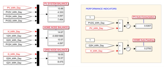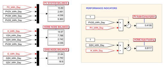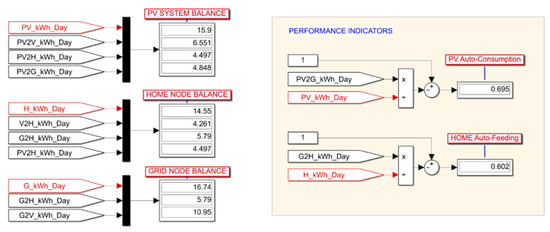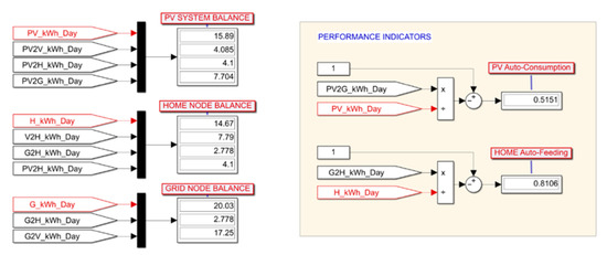 Figure 12 shows the annual energy balances for the three main node of the V2H network, namely PV system, home and grid, and the values of the performance indicators.