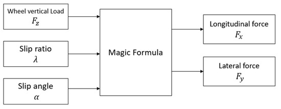 In order to find the longitudinal and lateral forces (and ) in the previous vehicle dynamic equations of motion Equations (1) and (3), the Magic Formula can be used [22]. Figure 1 illustrates the inputs and outputs of the Magic Formula. The inputs are the tire slip angle, slip ratio, and the normal load of the wheel. The results from the Magic Formula are the longitudinal and lateral forces of the wheel, namely, and . Detailed explanation of the calculations of the Magic formula can be found in [22].