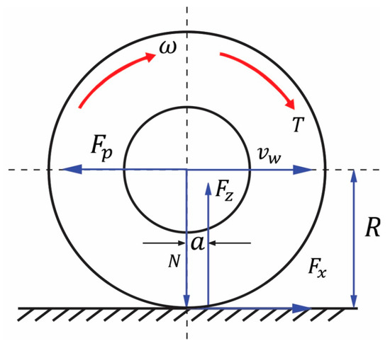 The wheel equation of motion Equation (5) is applied to calculate the wheel slip ratio, one of the inputs of the Magic Formula, and it is also used to find the wheel angular velocity. Equation (5) is applied based on the force wheel system shown in Figure 2. It can be found as: