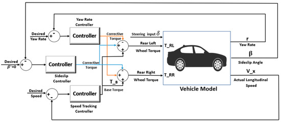 In this section, three independent DYC algorithms are designed to control the yaw rate, the sideslip angle, and the vehicle’s longitudinal velocity, simultaneously. Each control method has three controllers to minimize the error between the desired yaw rate, sideslip angle and actual values in order to enhance vehicle handling and stability. The general block diagram for the closed loop control system is shown in Figure 3.