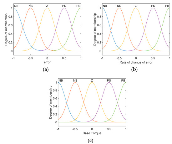 The membership functions of (a) the error, (b) rate change of the error, and (c) base toque.