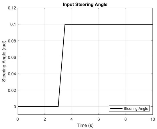 The rear-wheel-drive electric racing car model in this paper is tested under a circular-path maneuver. The circular path is achieved through a step input steering angle or ramp input with a short increasing time. Ramp input has a “softer” response than step input [33]. After trying both, the simulations showed that step input cause very high errors at the step instant, which provides a tremendous amount of torque at that moment; however, ramp input showed more stable and realistic behavior. The selected ramp steering input is shown in Figure 5. This signal is applied to the racing vehicle under the six control methods to find the best performance and stability. The longitude desired speed remains constant during the simulation at 20 m/s (72 km/h). Simulation time is selected to be ten seconds.