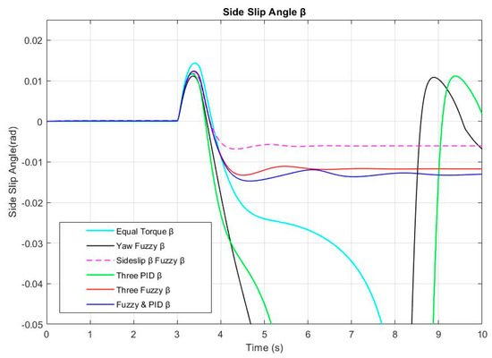 The sideslip response in Figure 6 shows that the equal torque, yaw rate fuzzy, and the three PID controllers cannot handle the vehicle to keep stable while turning in a circular path at the desired speed. The sideslip fuzzy controller achieves the minimum sideslip root mean square error (RMS) error with a value of 0.0053. The three-fuzzy-controllers method has an RMS error of about 0.0095, and the fuzzy with the PID control method has a relative RMS error value of 0.0105. These three control methods can keep the vehicle stable while turning.