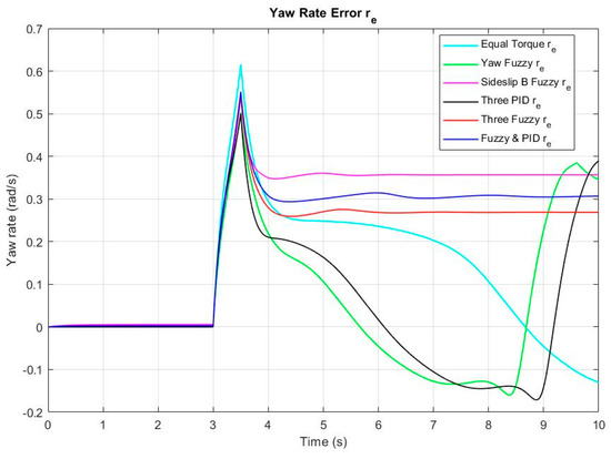 Yaw rate error responses are represented in Figure 7. Yaw rate error response for the six control methods. The more stable responses are produced by sideslip fuzzy, three fuzzies, and fuzzy with PID, which have RMS yaw rate error values of 0.299, 0.237, and 0.2634, respectively.