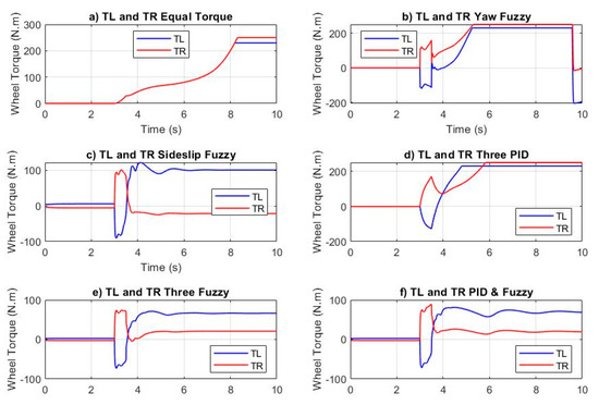 The torque input signals of the driving rear wheels of the six control methods are shown in Figure 8. As the figure illustrates, the plots of three controllers reached saturation. These controllers are equal torque, yaw rate fuzzy, and three PIDs. These three controllers also showed large sideslip-angle error and yaw-rate error as in Figure 6 and Figure 7. The sideslip fuzzy has a maximum torque of about 122 N·m and minimum torque of almost −86 N·m. The steady-state torque values of the left and right wheels (TL and TR) are about 101 and −22 N·m, respectively. The three fuzzy control method’s extreme values are around 71 N·m and −67 N·m, and steady-state torque values are 21 N·m and 66 N·m for the right and left wheels, respectively. The fuzzy with the PID control method has a maximum torque of about 89 N·m and a minimum of almost −71 N·m; the left wheel’s steady-state torque is around 69 N·m and of the right about 21 N·m. The three fuzzy control method has the minimum input torque.