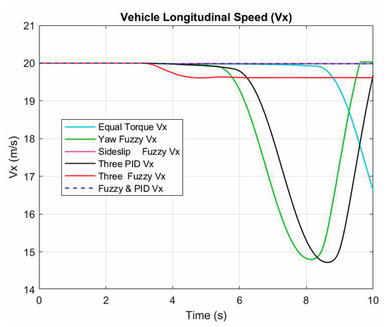 The longitudinal speed response of all controllers is shown in Figure 9. The sideslip angle fuzzy and fuzzy with PID control methods have the closest value to the desired value of 20 m/s. The three fuzzy control method has a final desired velocity of 19.62 m/s with a steady-state error of 1.9%. In contrast, the other three methods, namely, equal torque, yaw rate fuzzy, and three PID, have faraway values that decrease to less than 15 m/s.