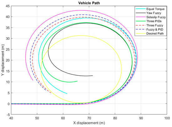 The simulation is run for 9 s to be able to find the fastest control method, and the result as shown in Figure 10. Among the six methods, the sideslip fuzzy method is the slowest one and has the farthest path from the desired path. In comparison, the three-fuzzy-controllers method is slightly faster than the fuzzy with the PID control method, which means the vehicle will complete the circular path first. The yaw rate fuzzy controller and the three-fuzzy-controller methods’ paths are almost identical, which are the closest complete paths to the desired one.