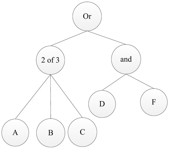 In a ciphertext policy attribute based encryption (CP-ABE) scheme, a tree data structure is used to make the encryption key of the data invisible. The data in the leaf node of the structure are attributes and attribute values, which are uploaded by the program formulated by the maker. The parent node passes invisible secret values to the leaf node. If the data requester wants to obtain the secret, it must match its own attributes with the corresponding attributes in the node. A non-leaf node is actually a threshold node [13]. The attributes of the data requester should at least meet the minimum threshold of the corresponding attributes under the node. For example, as shown in Figure 1, the number of child nodes of this node is 5 and the threshold is 3/5. In other words, to decrypt this secret, it conforms to two attributes in leaf nodes A, B, and C of the left subtree of the root node, or conforms to the attributes in leaf nodes D and F of the right subtree of the root node. If only one attribute on the left and right sides matches, it cannot be decrypted. To ensure that it can be decrypted, it must match the attributes in at least three child nodes.