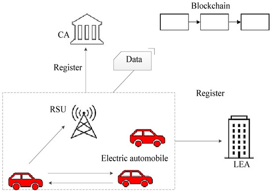 The structure of the vehicle safety communication system based on a blockchain consists of four parts: certification authority (CA), law enforcement agency (LEA), roadside unit (RSU), and vehicle, as shown in Figure 2.