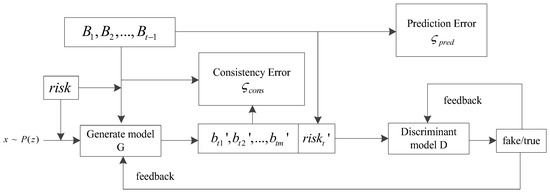 Based on the idea of generating a countermeasure network, the risk forecast problem of electric vehicle networking nodes is transformed into the generation problem of behavior sequence in the generation countermeasure network [26,27]. Let the behavior sequence of nodes be , where is the set of overall behavior sequences of nodes, is the behavior sequence at a certain time, so that contains behavior attributes, such as is the amount of data sent, is the amount of data received, and is the risk level. Given the real historical communication behavior sequence , a new behavior sequence can be generated by generating model , where is the forecasted risk level.