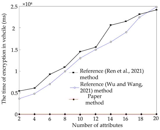 Compared with the two traditional methods, the encryption time for private vehicles is greatly reduced. This is because the private vehicle in this method only needs to encrypt the symmetric key once, and other encryption processes and judgment processes are completed with the assistance of other entities. Therefore, the computational cost of private vehicle encryption in this method is very small, and it always maintains a horizontal straight line with the increase in the number of attributes.
