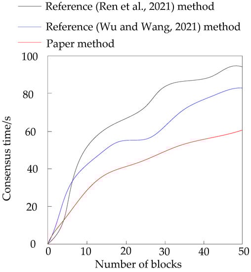 To test the consensus efficiency, a car is regarded as a block, and the consensus time of different blocks is tested. The trend of consensus time with the number of nodes is shown in Figure 9. By analyzing Figure 9, it can be found that when the number of nodes reaches 50, the consensus time is nearly 60 s, and the consensus time increases linearly with the number of nodes. Under different numbers of nodes, the consensus time is always lower than in other methods. This is because the consensus process of this method is based on convolution neural network calculation, which greatly reduces the amount of computation, making the verification of nodes faster and the consensus efficiency higher.