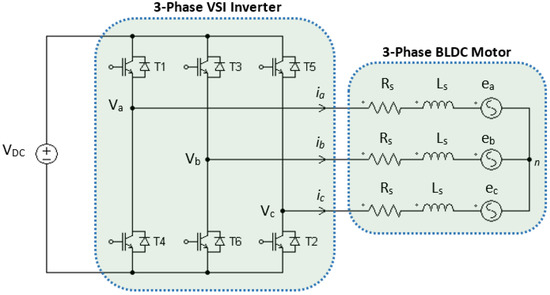 The simplified equivalent circuit of the BLDC motor is shown in Figure 1, where the per-phase stator winding is represented by a resistance (Rs) and the equivalent inductance (Ls). The per-phase back-EMFs (ean, ebn, and ecn) are sinusoidal waveforms in the case of a BLAC motor, but trapezoidal in the case of the BLDC. The back-EMFs are displaced 120 electrical degrees from each other. The motor is driven by a three-phase inverter, where the position of the rotor magnetic field should be detected instantaneously for proper switching commutation with the aid of three Hall sensors installed inside the BLDC motor on the stator frame [48].