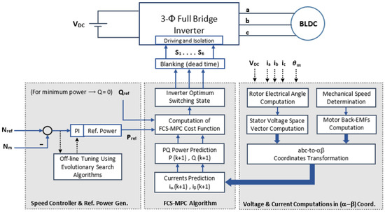 Block diagram of the direct PQ control scheme for the BLDC motor drive using the FCS-MPC approach.