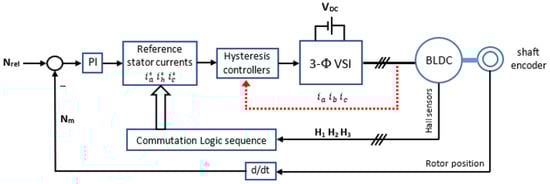 The third investigated scheme of the BLDC motor is illustrated in Figure 4. In this scheme, the motor speed is regulated by a PI-type speed controller. The output of the speed controller represents the amplitude of the reference (desired) 3-Φ stator currents (Imax), whereas the waveforms of the reference stator currents (quasi-square waves of 120° mode) are generated with the aid of a commutation logic decoder, which converts the status of the three Hall sensors into 3-Φ signals displaced 120 electrical degrees from each other. The stator currents are controlled by three hysteresis current controllers with a certain tolerance band. The outputs of the ON–OFF current controllers are employed to generate the switching signals of the transistors of the 3-Φ VSI inverter.