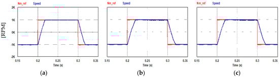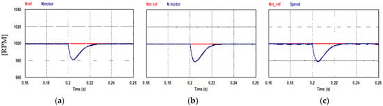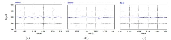 Motor mechanical speed at steady state (Nref = 1000 rpm): (a) PQ controlled FCS-MPC; (b) current controlled FCS-MPC; (c) hysteresis current controller.