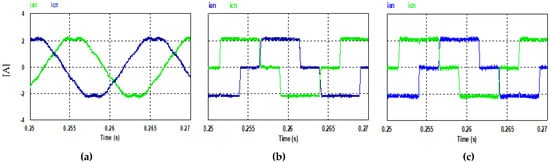 Steady state stator currents ia and ic (Nref = 1000 rpm): (a) PQ controlled FCS-MPC; (b) current controlled FCS-MPC; (c) hysteresis current controller.
