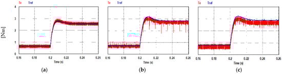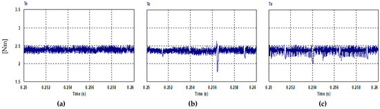 Steady state electromagnetic torque at (Nref = 1000 rpm, TL= 2.5 N.m): (a) PQ controlled FCS-MPC; (b) current controlled FCS-MPC; (c) hysteresis current controller.
