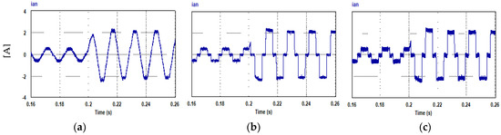Corresponding stator current ia drawn by the motor (Nref = 1000 rpm, TL = 2.5 N.m, JL = 0.002 kg m2): (a) PQ controlled FCS-MPC; (b) current controlled FCS-MPC; (c) hysteresis current controller.