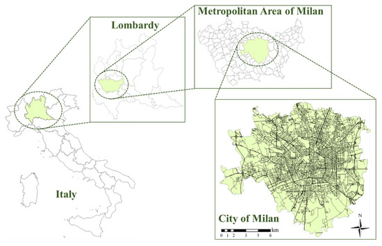 - From a theoretical point of view, the analysis must consider data in a wider area than that considered as a case study (the city of Milan), according to [4]. However, data related to the surrounding areas close to Milan suffer from a lack of information and are not as precise as those from Milan. Therefore, the data considered in the case study are from the city of Milan, except for “Air Quality”, as discussed in the following;