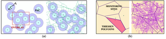 Figure 5. Data processing methodology (a) Multiple Ring Buffer; (b) Areal—Thiessen Polygon.Moreover, in line with the previous parameters, the value for each road (KIroad) is calculated by re-arranging Equation (2). - Primary Attraction Centers (PAC): this criterion involves facilities whose importance attracts high levels of vehicle traffic: hospitals, pharmacies, schools and railway stations [27,28,29,30].In line with KI, the parameter values were defined using the “multiple ring buffer” methodology (Figure 5), in which roads close to numerous PAC assume higher values. Once again, the value for each road (PACroad) was calculated by re-arranging Equation (2).