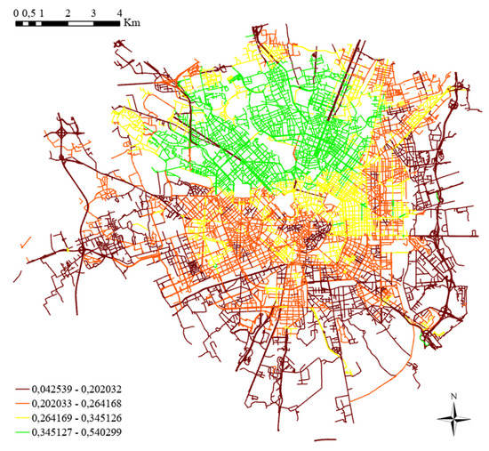 The final map of the city of Milan is shown in Figure 6, in which green-colored roads (23.25% of the total network) are characterized by higher FI values and dark red-colored roads (22.03%) show lower FI values. The four intervals shown in the legend were obtained using the Jenks natural breaks classification method.