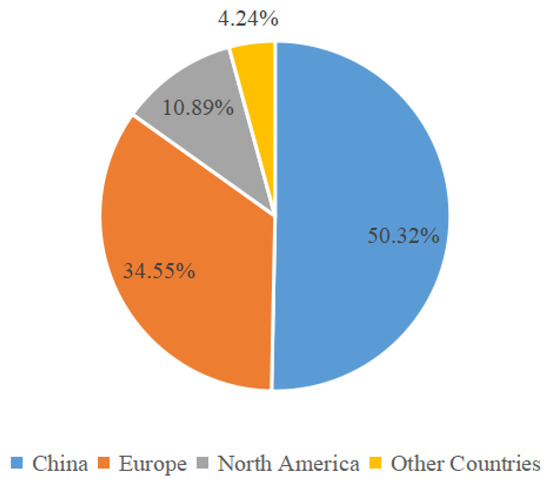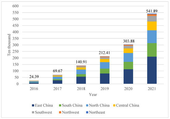 Achieving the “30·60” double carbon target is an important direction for China’s future development. At present, the energy, industry, and transportation sectors are the main sources of carbon emissions, accounting for more than 80% of China’s total carbon dioxide emissions. Achieving the goal of carbon neutrality requires the coordinated development of low carbon by multiple industries [1,2]. China aims to raise its global competitiveness in the transport sector by setting up transport networks with wider coverage and higher speed. Terminal energy in China’s transportation sector is becoming increasingly electrified, and the charging load of electric vehicles will become one of the largest loads in future grids. Since 2015, the number of electric vehicles in various provinces and cities in China has increased significantly. In 2016, the number of electric vehicles in China was about 240,000, and in 2021, it exceeded 5.41 million, with a year-by-year growth rate of 78.32% in the latest year. The growth of electric vehicle ownership between China’s seven major administrative geographical divisions varies greatly. From 2016 to 2021, the ownership and changing trend of electric vehicles in China are shown in Figure 1. China’s electric vehicle sales account for 50.32% of the global electric vehicle market sales, as shown in Figure 2.