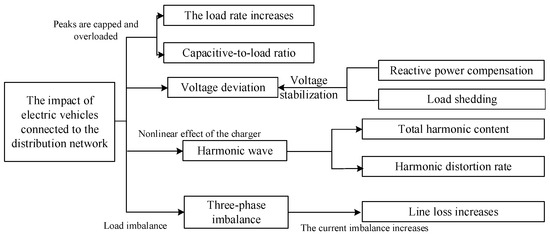 The impact of electric vehicle charging loads on various indicators of distribution network is interrelated (as shown in Figure 3). Disorderly charging of electric vehicles will cause heavy overloads, increase peak-on-peak, and enlarge the difference between peak-and-valley. At this point in time, the load rate will increase and the capacity load ratio will decrease. After the charging loads of electric vehicles are connected to the distribution network, the safety and stability of the system decreases, resulting in voltage offset. It is necessary to stabilize the voltage through reactive power compensation. The nonlinear effect of electric vehicle chargers will lead to harmonic pollution. In the case of disorderly access of large-scale electric vehicles, the three-phase load imbalance and current imbalance increase, and the line loss increment increases.