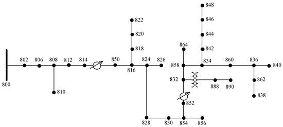 In this paper, the modified IEEE 34-bus network is used for simulation analysis, the IEEE 34-bus network distribution is shown in Figure 4, and the node data is shown in Appendix A, Table A1, Table A2, Table A3, Table A4, Table A5, Table A6 and Table A7. The voltage level of the distribution network is 10 kV and the reference power is 10 kW. The rated power of the AC charging pile in the residential area is 7 kW; the power of the AC charging pile in the commercial area is 7 kW; the power of the DC charging pile in the commercial area is 120 kW; and the DC charging pile in the centralized charging station is rated at 120 kW. The battery capacity takes 25 kWh, and the charging efficiency of the charging facility is 0.95.