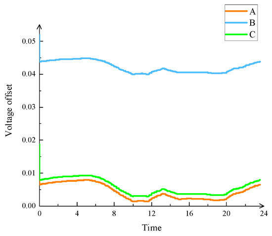 The calculations in this paper were solved in a MATLAB environment on a computer with a processor of 11th Gen Intel(R) Core(TM) i7-1165G7 and a clock frequency of 2.7 GHz, and the maximum calculation time was 2 min. The maximum number of iterations in the solution process of the multi-objective optimized particle swarm algorithm was 300, the number of particle swarms was 60, the initial inertia weight was 0.85, and the acceleration constant was 1.25. Under the simulation conditions set in this paper, the load peak, load fluctuation, and voltage offset of each node of the distribution network were optimized. In the simulink simulation experiment, the voltage offset value in V2G mode is shown in Figure 5, and the voltage shift occurs at the moment of load access of the electric vehicle, and the maximum voltage offset of A phase is 1.75%, the maximum voltage offset of B phase is 5.19%, and the maximum voltage offset of C phase is 1.87%. The trend of three-phase voltage balance is shown in Figure 6. Because the load of electric vehicles entering the grid accounts for a small proportion of other loads in the power supply area, the voltage offset and three-phase voltage imbalance are within the allowable range.