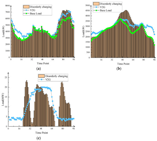 The larger the load standard deviation, the greater the burden of frequency regulation on the power grid, in which it is easy to cause frequency fluctuations and voltage fluctuations, affecting the power quality. The power supply quality of the distribution network can be reflected through the load standard deviation. According to the comparison of the distribution network evaluation indicators in the disordered charging mode and V2G mode in the residential area in Figure 7a and Table 2, the V2G mode of electric vehicles reduces the superposition rate of electricity load in the community compared with the disordered mode. According to the allocation capacity configuration model in Section 4.5, the number of distribution transformers in different charge and discharge modes is calculated, the V2G mode reduces the transformer transformation cost, and the investment in distribution capacity and related equipment is CNY 1.75 million per 1000 kVA [38], saving CNY 5.25 million. Compared with the disordered charging mode, the load standard deviation in V2G mode is reduced by 705.31 kW, and the peak-to-valley difference is reduced by 42.66%, which greatly enhances the power quality of the distribution network.