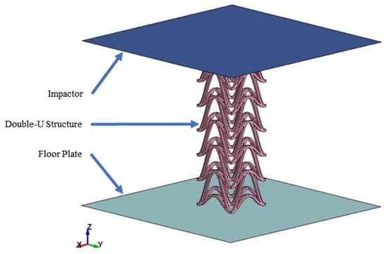 The general configuration of the validating simulation consists of (from top to bottom) the impactor, double-U cell, and floor, where the distance between each part is set to be as close as possible without pre-penetration. A rigid shell plane with element size of and thickness of is used as the impactor and floor. Figure 1 illustrates the general configuration of this model.