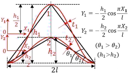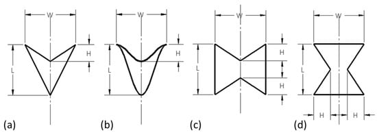 The modeling of single-cell structure optimization is based on Section 2.1’s model with some changes. The optimization model’s general configuration and boundary condition stay the same as the validation model. Firstly, this simulation only analyzes single-cell structures from each geometric shape: double-arrowed [17], double-U [18], re-entrant A [19,20,21], and re-entrant B [19,20,21]. Because of the difference in geometric parameters between each geometric shape, there is a need to create new geometric parameters that can accommodate all of the geometric shapes in this research to ease the optimization process. It was decided that four parameters are enough to explain the size of all geometric shapes, which are length (L), width (W), bending height (H), and thickness of the cross-section. The cross-section of all cells in this research is limited to an equal-sided square. Figure 6 illustrates the new geometric parameters.