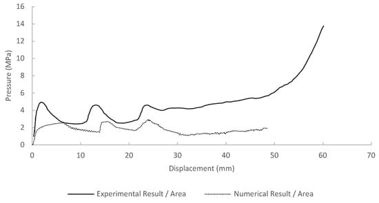 There is a significant difference between the numerical model and the experiment condition. The experiment object is configured in unit cells (compared to unit cells in the numerical model). This change was performed because of the limitations of computing power that the writer had access to. To combat this difference, the results from both the experimental and numerical models are divided by their footprint area (area of the floor that the specimen occupies), resulting in a pressure–displacement curve displayed in Figure 4.