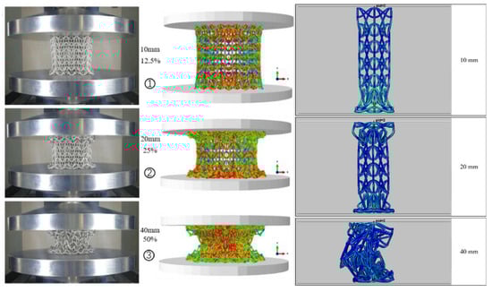 Reference’s experimental results (left), reference’s numerical results (middle), and writer’s numerical results (right) of quasistatic compression of double-U structure.