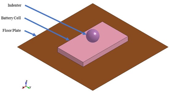 The general configuration of the recreation simulation consists of (from top to bottom) the indenter, battery cell, and floor, where the distance between each part is set to be as close as possible without pre-penetration. A rigid shell sphere with a radius of is used as the indenter, and a rigid shell plane is used as the floor, both with element size of and thickness of . Figure 8 illustrates the general configuration of this model.